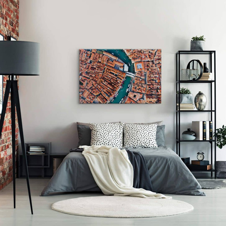 Mit der Reise nach Venedig werden für viele Romantiker die Wünsche wahr: Historische Bauwerke besichtigen, imposante Brücken überqueren und eine Gondelfahrt auf dem Canal Grande machen. Wer Städtetrips liebt, muss unbedingt einen Stopp in dieser Lagunenstadt einlegen. Das Herzstück der Stadt ist der Markusplatz. Hier befinden sich besonders viele, eindrucksvolle Sehenswürdigkeiten. Die kleinen Gassen aus Kopfsteinpflastern, in denen man süsse Cafés und Restaurants findet, versprühen den eigentlichen Charme der Stadt. Aus der Vogelperspektive bekommt man ganz besondere Impressionen von diesem einzigartigen Ort, der vom Wasser umgeben ist. Mit diesem Städte-Motiv holen Sie sich ein Stück mediterranen Charme zu Ihnen nach Hause.