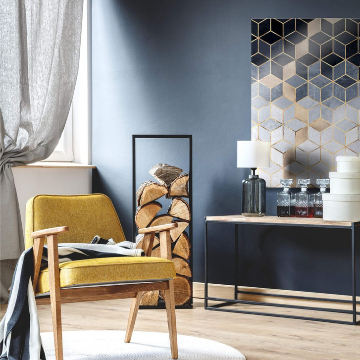 Durch die abgesetzten goldfarbenen Flächen werden die geometrischen Formen und Körper in 3D-Optik verdeutlicht. Die verschiedenen Blautöne und die goldfarbene Linienführung mit dem Glitzereffekt zaubern einen glamourösen Blickfang an jeder Wand! Verschönern Sie Ihre Räume mit den kreativen und innovativen Designs von Fredriksson!