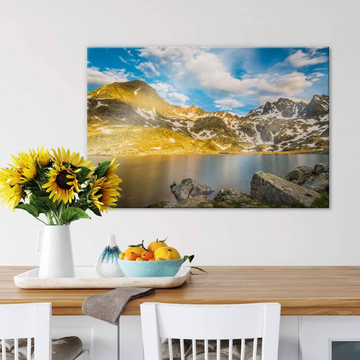 Gestalten Sie Ihre Wände mit originellen Bildern schaffen Sie ein entspanntes Wohnambiente mit unseren Wandbildern! Besonders gut eignen sich die Fotografien des Künstlers Huber dazu. Dieses Acrylglasbild gibt einen schönen Ausblick auf den spiegelglatten Surettasee, der auf dem Gebiet der Gemeinde Splügen in der Schweiz liegt. Er ist mit einer Höhe von 2266m über dem Meeresspiegel direkt in den Bergen und nur durch einen steilen Aufstieg zu Fuss zu erreichen.