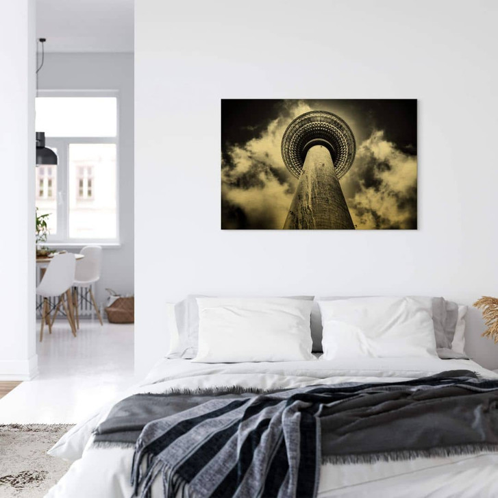 Hier steht ein Berliner Wahrzeichen im Mittelpunkt: Der eindrucksvolle Fernsehturm. Der imposante Turm, der knapp 370 Meter misst, wird aus der Froschperspektive gezeigt. Diese lässt ihn noch gigantischer erscheinen. Zudem lässt der Schwarz-Weiss Effekt das Bild etwas dramatisch wirken. Der Blick zum Himmel ist einfach unbeschreiblich. Mit dem Fotomotiv "Fernsehturm Berlin" ist dem Fotokünstler Jeans Brown gelungen, die faszinierende Atmopsphäre vom Berliner Alexanderplatz einzufangen. Der beliebte Platz ist auch als Wandbild in jedem Fall sehenswert - spüren Sie das Hauptstadt-Flair in den eigenen vier Wänden!