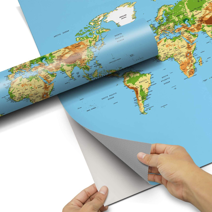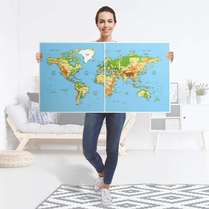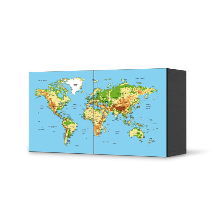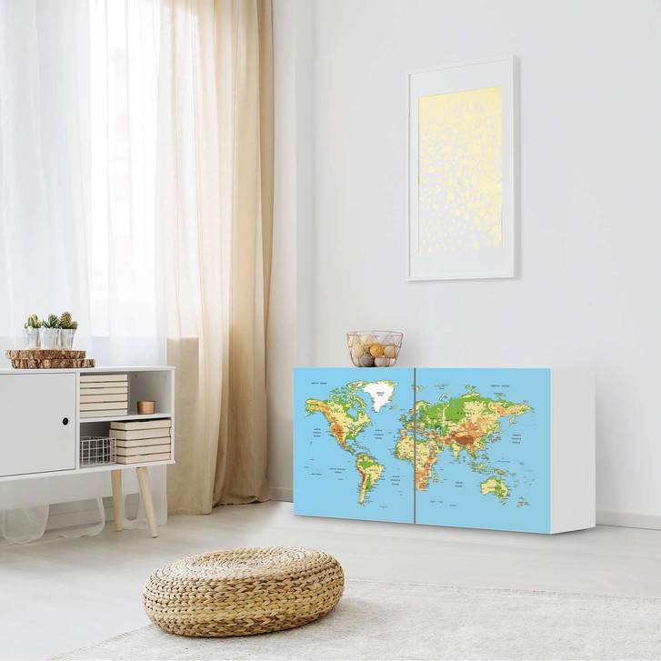 Unsere Folie Geografische Weltkarte für das Besta Regal 2 Türen (quer) ist der Blickfang in jedem Wohnzimmer. Die Dekofolien sind hochwertige, selbsthaftende Vinylfolien (seidenmatt) und können dank Bubble-free Technologie kinderleicht verklebt werden.