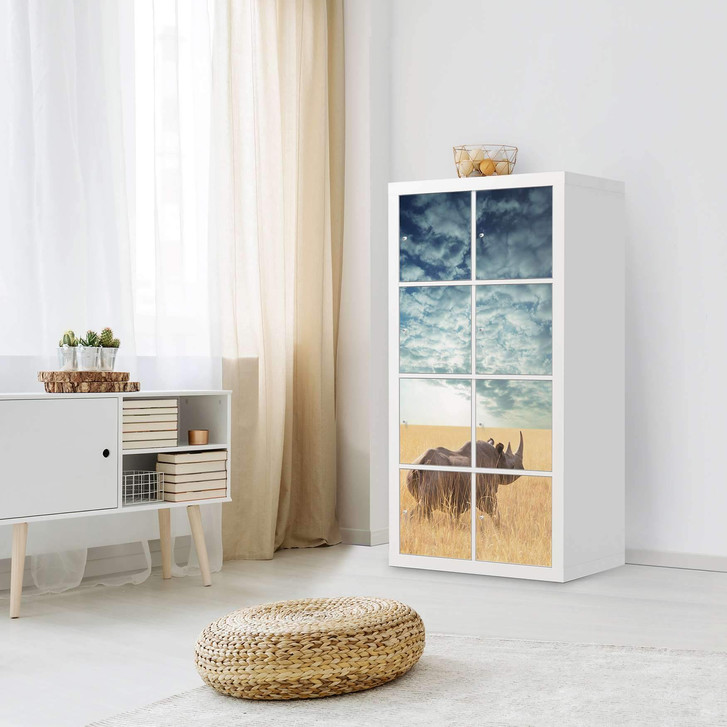 Unsere Folie Rhino für das Kallax Regal 8 Türen ist der Blickfang in jedem Wohnzimmer. Die Dekofolien sind hochwertige, selbsthaftende Vinylfolien (seidenmatt) und können dank Bubble-free Technologie kinderleicht verklebt werden.