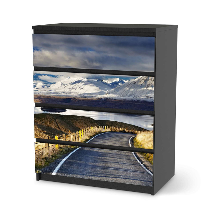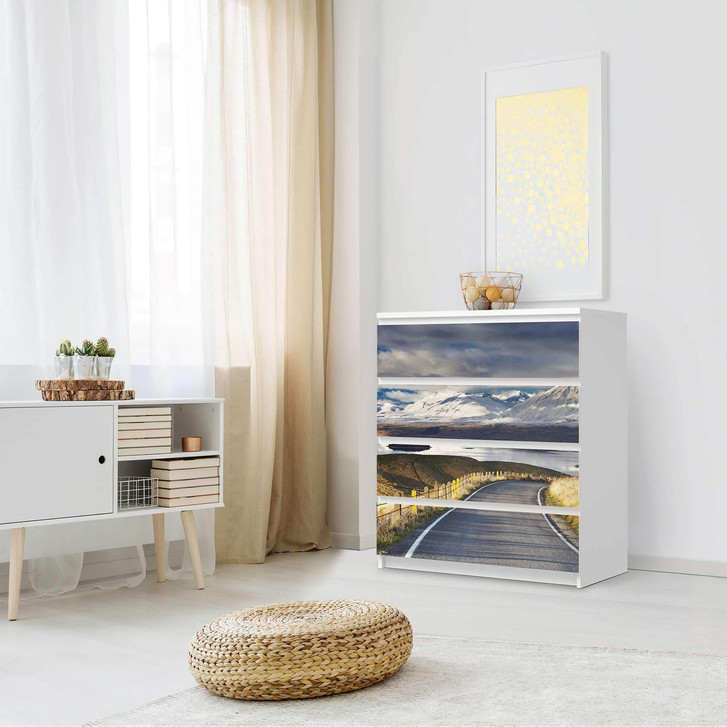 Unsere Folie New Zealand für die Malm Kommode 4 Schubladen ist der Blickfang in jedem Schlafzimmer. Die Dekofolien sind hochwertige, selbsthaftende Vinylfolien (seidenmatt) und können dank Bubble-free Technologie kinderleicht verklebt werden.
