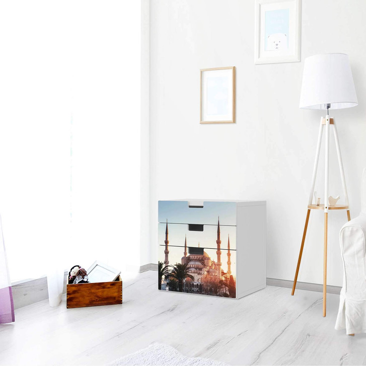 Unsere Folie Blue Mosque für die Stuva Kommode - 3 Schubladen ist der Blickfang im Wohnzimmer. Unsere Dekofolien sind hochwertige, selbsthaftende Vinylfolien (seidenmatt) und können dank Bubble-free Technologie kinderleicht verklebt werden.