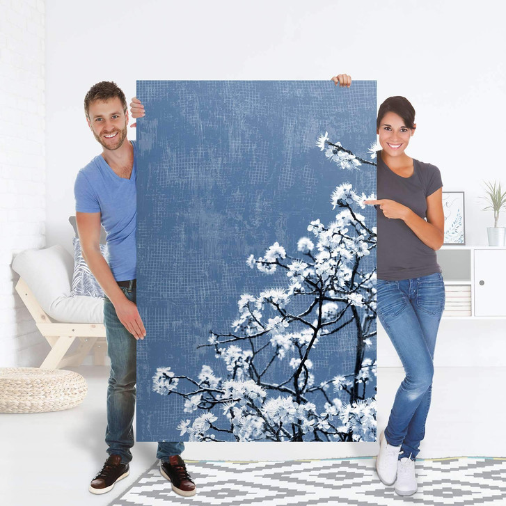 Das Trägerpapier von der Folie ca. 10-20 cm abziehen und am oberen Bereich des Objektes positionieren. Zieh jetzt das Trägerpapier Stück für Stück von der Motivfolie nach unten hin ab und streiche das Motiv vorsichtig an der Möbeloberfläche fest.