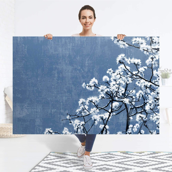 Das Trägerpapier von der Folie ca. 10-20 cm abziehen und am oberen Bereich des Objektes positionieren. Zieh jetzt das Trägerpapier Stück für Stück von der Motivfolie nach unten hin ab und streiche das Motiv vorsichtig an der Möbeloberfläche fest.