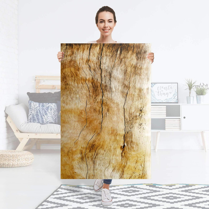 Das Trägerpapier von der Folie ca. 10-20 cm abziehen und am oberen Bereich des Objektes positionieren. Zieh jetzt das Trägerpapier Stück für Stück von der Motivfolie nach unten hin ab und streiche das Motiv vorsichtig an der Möbeloberfläche fest.