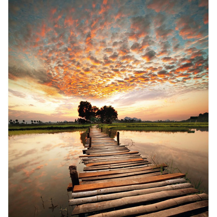 Das Motiv zeigt einen alten Holzsteg, der die vorbeikommenden Naturliebhaber auf die andere Seite des Ufers bringt.