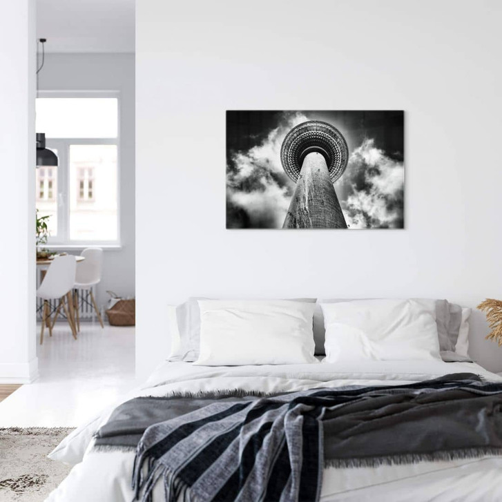 Der Berliner Fernsehturm ist nicht nur das höchste Bauwerk der deutschen Hauptstadt, er ist gleichzeitig auch das höchste Bauwerk Deutschlands. Mit einer Höhe von knapp 370 Metern bildet der Ende der 1960er Jahre fertiggestellte Fernsehturm das wichtigste Wahrzeichen Berlins.Der gigantische Turm wird aus der Froschperspektive gezeigt. Diese lässt ihn noch eindrucksvoller erscheinen. Zudem lässt der Schwarz-Weiss Effekt das Bild etwas dramatisch wirken. Der Blick zum Himmel ist einfach unbeschreiblich. Mit dem Fotomotiv "Fernsehturm Berlin" ist dem Fotokünstler Jeans Brown gelungen, die einzigartige Atmopsphäre vom Berliner Alexanderplatz einzufangen. Der beliebte Platz ist auch als Wandbild in jedem Fall sehenswert - spüren Sie das Hauptstadt-Flair in den eigenen vier Wänden!