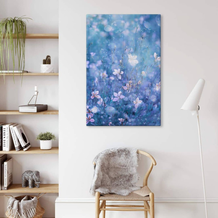 Romantisch-verträumt: Die Fotografie der malerischen Wiese verwandelt den Wohnbereich in eine bezaubernde Blütenlandschaft in lila-blauen Farben. Kleine Blumen und Pflanzen harmonieren wunderbar mit den zarten Farben, die zum absoluten Hingucker werden. Ob im Wohn- und Schlafzimmer oder auch im Kinder- und Jugendzimmer: Das Fotomotiv verbreitet eine angenehm beruhigende Atmosphäre im ganzen Raum. Geniessen Sie den Anblick des floralen Bildes und träumen ins Blaue hinein!