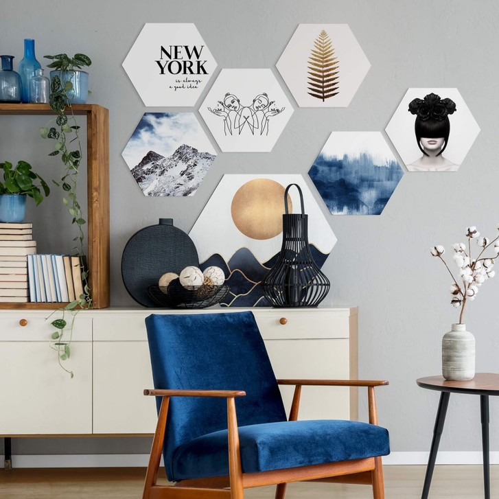 Gestalten Sie sich mit unseren Hexagon-Wandbildern eine einzigartige Galerie an Ihrer Wand. Unsere Wandbilder im Wabenmuster bzw. in sechseck-Form können zu einem trendigen Eyecatcher in Ihrer Wohnung werden. Die einzelnen Dekoelemente können sie nicht nur beliebig anordnen, sondern auch jederzeit erweitern. Dazu dienen Ihnen nicht nur eine Vielzahl an Motiven, sondern auch eine Reihe an unterschiedlichen Materialien. Ob zum Beispiel Holz, Alu-Dibond mit metallischen Effekten oder Wandtattoos – den Gestaltungsideen sind hier keine Grenzen gesetzt.