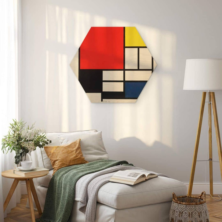 Hexagon - Holz Mondrian - Komposition mit Rot Gelb Blau und Schwarz