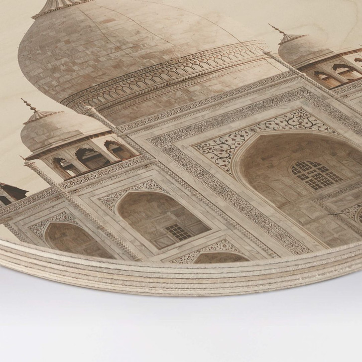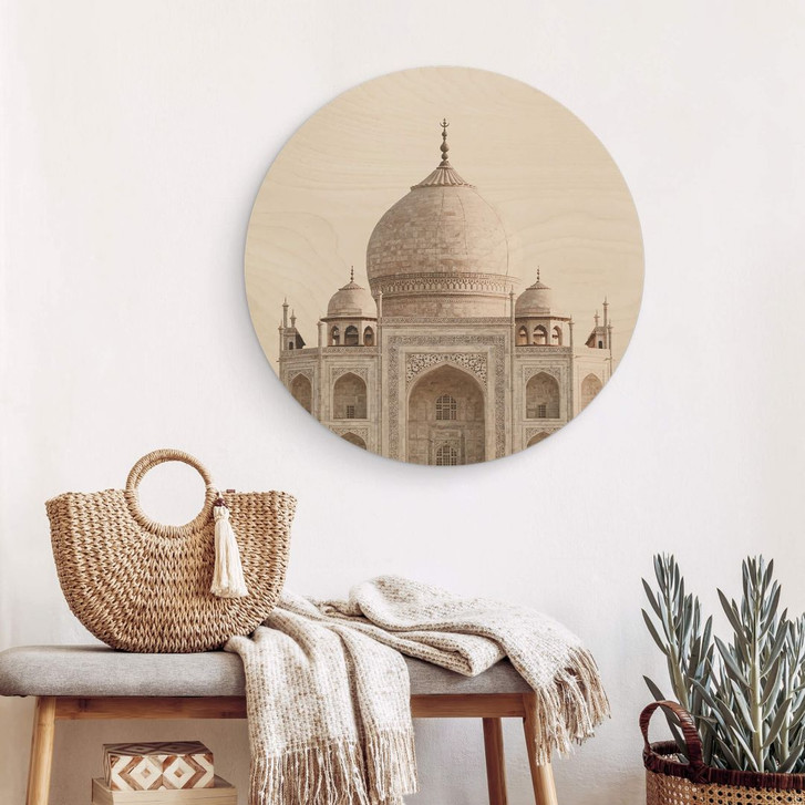 Indiens beliebteste Sehenswürdigkeit - Fotomotiv Taj Mahal als rundes Holzbild