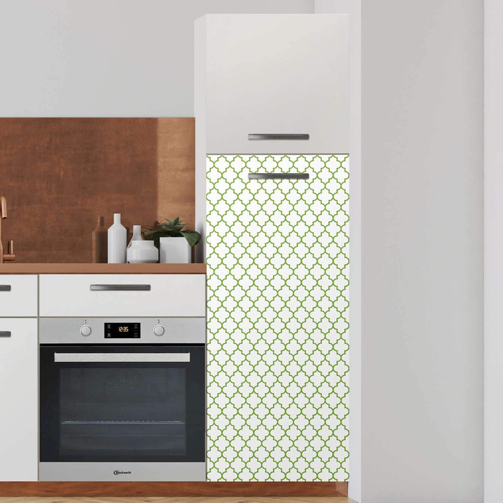 Unsere Klebefolie Retro Pattern - Grün für den Hochschrank (Grösse: 60x140cm) ist der Blickfang in jeder Küche. Die Küchenfolien sind hochwertige, selbsthaftende Vinylfolien (seidenmatt) und müssen auf das gewünschte Mass zugeschnitten werden.
