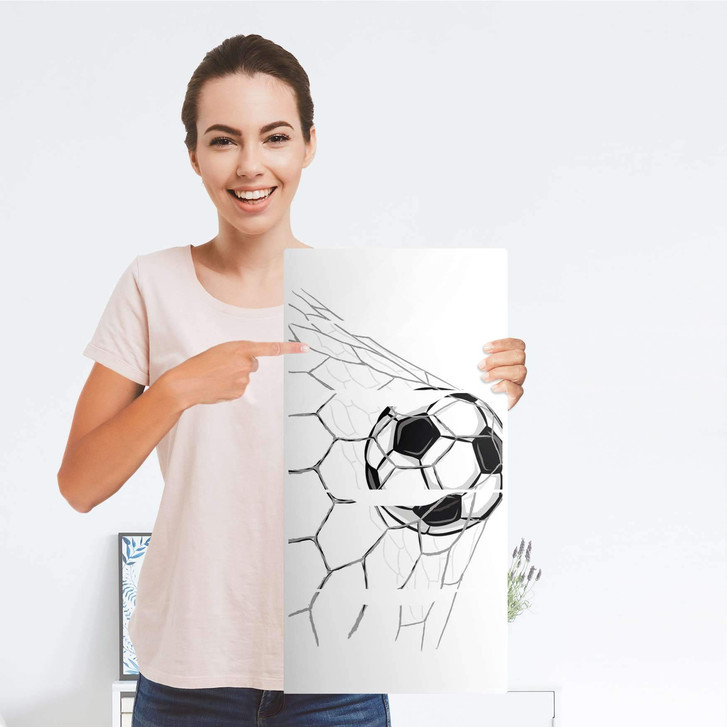 Das Trägerpapier von der Folie ca. 10-20 cm abziehen und am oberen Bereich des Objektes positionieren. Zieh jetzt das Trägerpapier Stück für Stück von der Motivfolie nach unten hin ab und streiche das Motiv vorsichtig an der Möbeloberfläche fest.