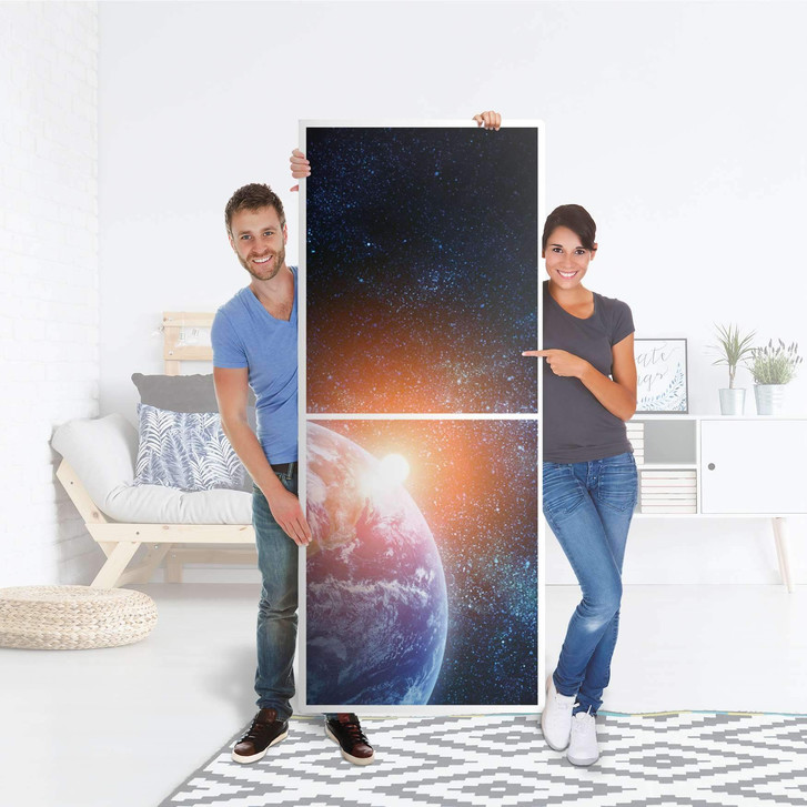 Unsere Klebefolie Sunrise für das Billy Regal 6 Fächer ist der Blickfang in jedem Wohnzimmer. Die Dekofolien sind hochwertige, selbsthaftende Vinylfolien (seidenmatt) und können dank Bubble-free Technologie kinderleicht verklebt werden.