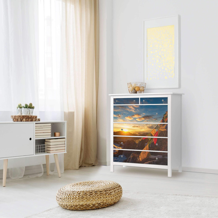 Unsere Klebefolie Tibet für die Hemnes Kommode 6 Schubladen ist der Blickfang in jedem Wohnzimmer. Die Dekofolien sind hochwertige, selbsthaftende Vinylfolien (seidenmatt) und können dank Bubble-free Technologie kinderleicht verklebt werden.
