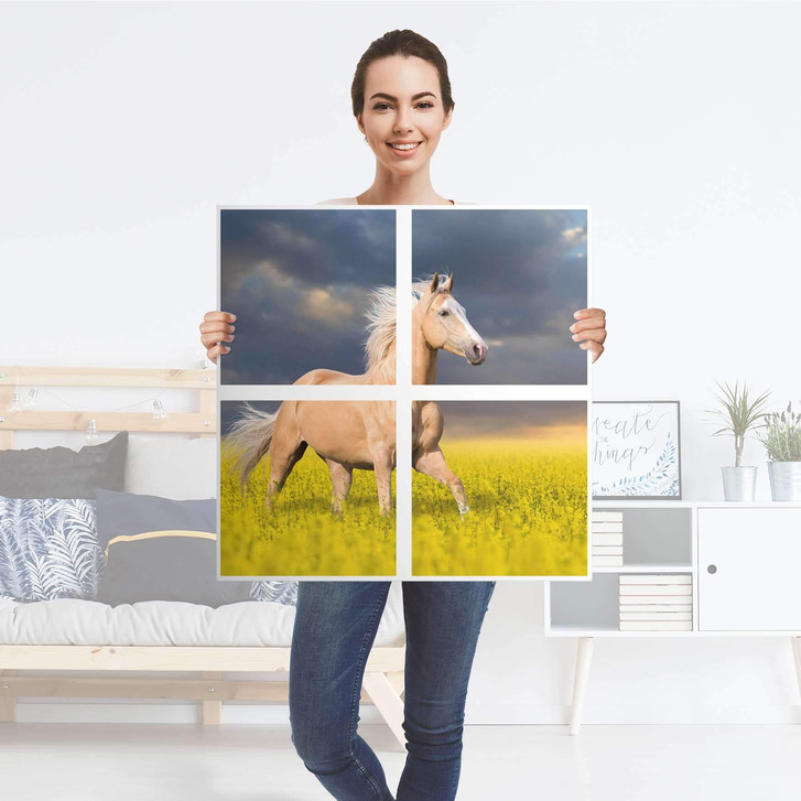 Unsere Klebefolie Wildpferd für das Kallax Regal 4 Türen ist der Blickfang in jedem Wohnzimmer. Die Dekofolien sind hochwertige, selbsthaftende Vinylfolien (seidenmatt) und können dank Bubble-free Technologie kinderleicht verklebt werden.