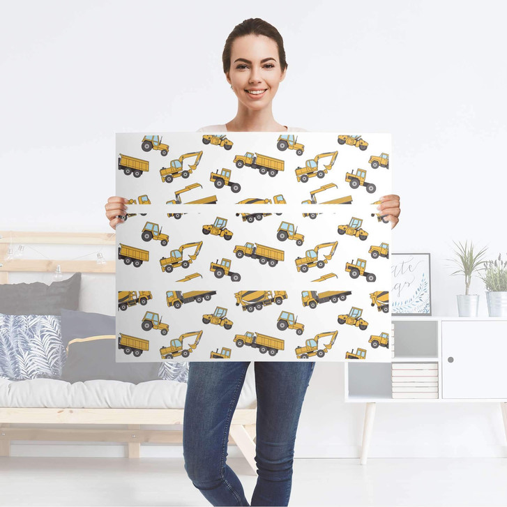Unsere Klebefolie Working Cars für die Malm Kommode 3 Schubladen ist der Blickfang in jedem Kinderzimmer. Die Dekofolien sind hochwertige, selbsthaftende Vinylfolien (seidenmatt) und können dank Bubble-free Technologie kinderleicht verklebt werden.