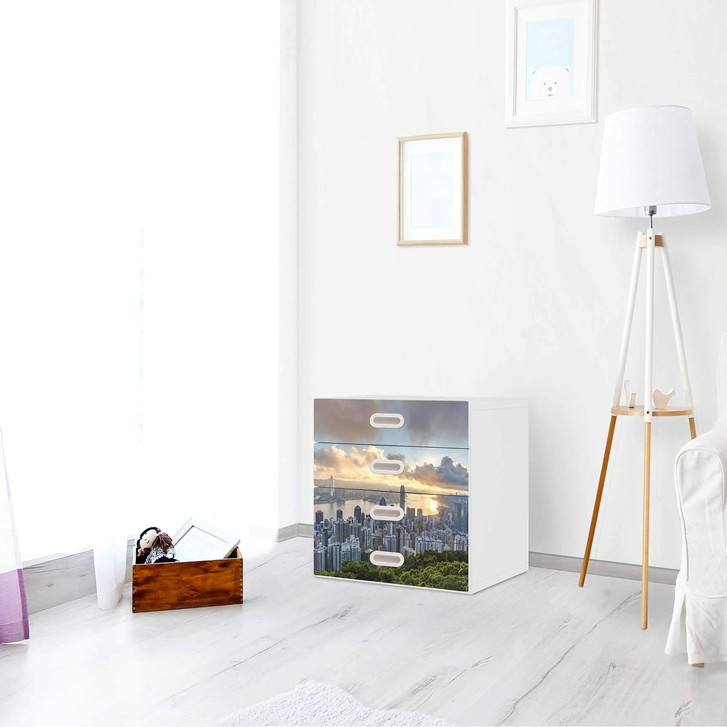 Unsere Klebefolie Hong Kong für die Stuva / Fritids Kommode - 4 Schubladen ist der Blickfang im Kinderzimmer. Unsere Dekofolien sind hochwertige, selbsthaftende Vinylfolien (seidenmatt) und können dank Bubble-free Technologie kinderleicht verklebt werden.