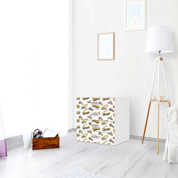 Unsere Klebefolie Working Cars für die Stuva / Fritids Kommode - 4 Schubladen ist der Blickfang im Kinderzimmer. Unsere Dekofolien sind hochwertige, selbsthaftende Vinylfolien (seidenmatt) und können dank Bubble-free Technologie kinderleicht verklebt werden.