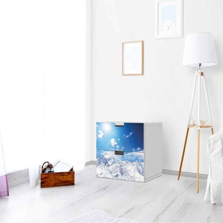 Unsere Klebefolie Everest für die Stuva Kommode - 2 Schubladen ist der Blickfang im Wohnzimmer. Unsere Dekofolien sind hochwertige, selbsthaftende Vinylfolien (seidenmatt) und können dank Bubble-free Technologie kinderleicht verklebt werden.