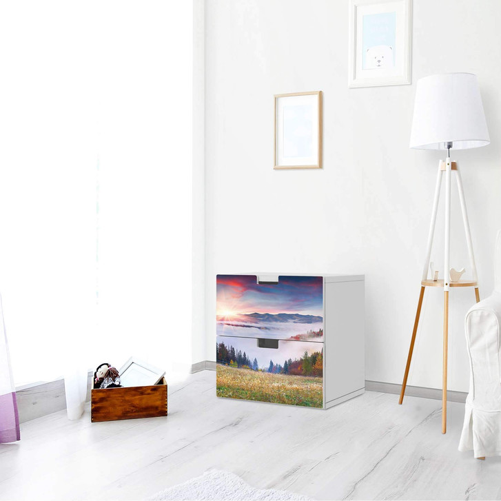 Unsere Klebefolie Herbstwald für die Stuva Kommode - 2 Schubladen ist der Blickfang im Wohnzimmer. Unsere Dekofolien sind hochwertige, selbsthaftende Vinylfolien (seidenmatt) und können dank Bubble-free Technologie kinderleicht verklebt werden.