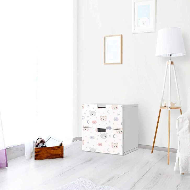 Unsere Klebefolie Sweet Dreams für die Stuva Kommode - 2 Schubladen ist der Blickfang im Kinderzimmer. Unsere Dekofolien sind hochwertige, selbsthaftende Vinylfolien (seidenmatt) und können dank Bubble-free Technologie kinderleicht verklebt werden.