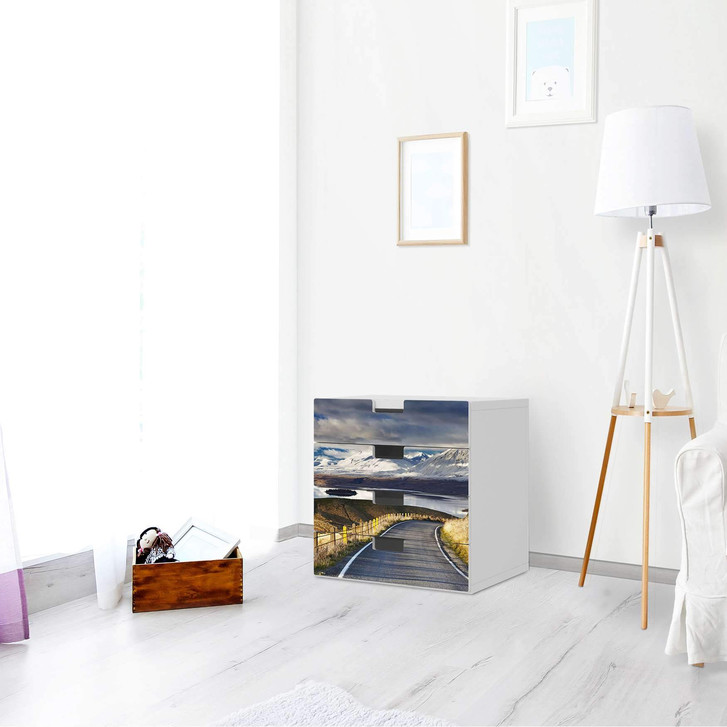 Unsere Klebefolie New Zealand für die Stuva Kommode - 4 Schubladen ist der Blickfang im Wohnzimmer. Unsere Dekofolien sind hochwertige, selbsthaftende Vinylfolien (seidenmatt) und können dank Bubble-free Technologie kinderleicht verklebt werden.