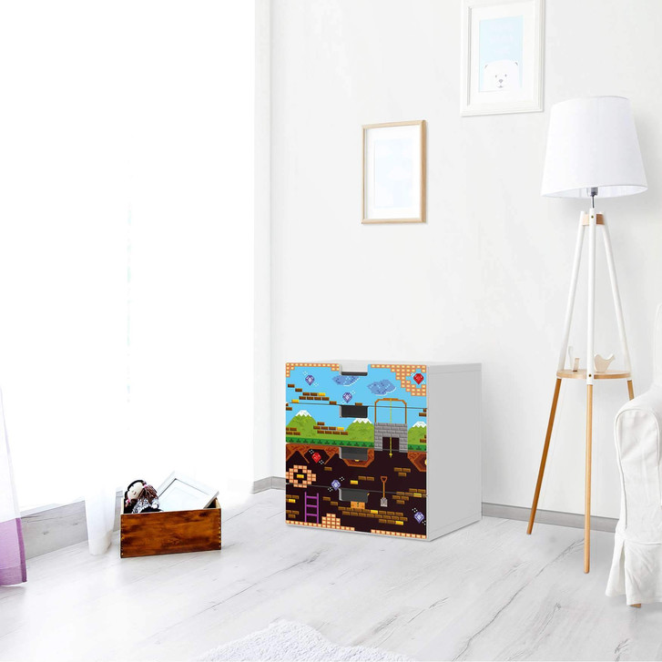 Unsere Klebefolie Pixelmania für die Stuva Kommode - 4 Schubladen ist der Blickfang im Kinderzimmer. Unsere Dekofolien sind hochwertige, selbsthaftende Vinylfolien (seidenmatt) und können dank Bubble-free Technologie kinderleicht verklebt werden.