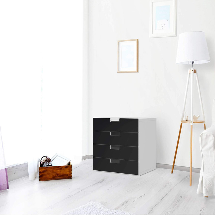 Unsere Klebefolie Schwarz für die Stuva Kommode - 4 Schubladen ist der Blickfang im Wohnzimmer. Unsere Dekofolien sind hochwertige, selbsthaftende Vinylfolien (seidenmatt) und können dank Bubble-free Technologie kinderleicht verklebt werden.