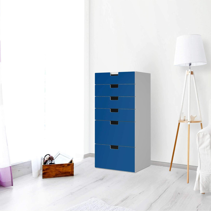Unsere Klebefolie Blau Dark für die Stuva Kommode - 6 Schubladen ist der Blickfang im Wohnzimmer. Unsere Dekofolien sind hochwertige, selbsthaftende Vinylfolien (seidenmatt) und können dank Bubble-free Technologie kinderleicht verklebt werden.