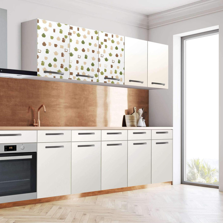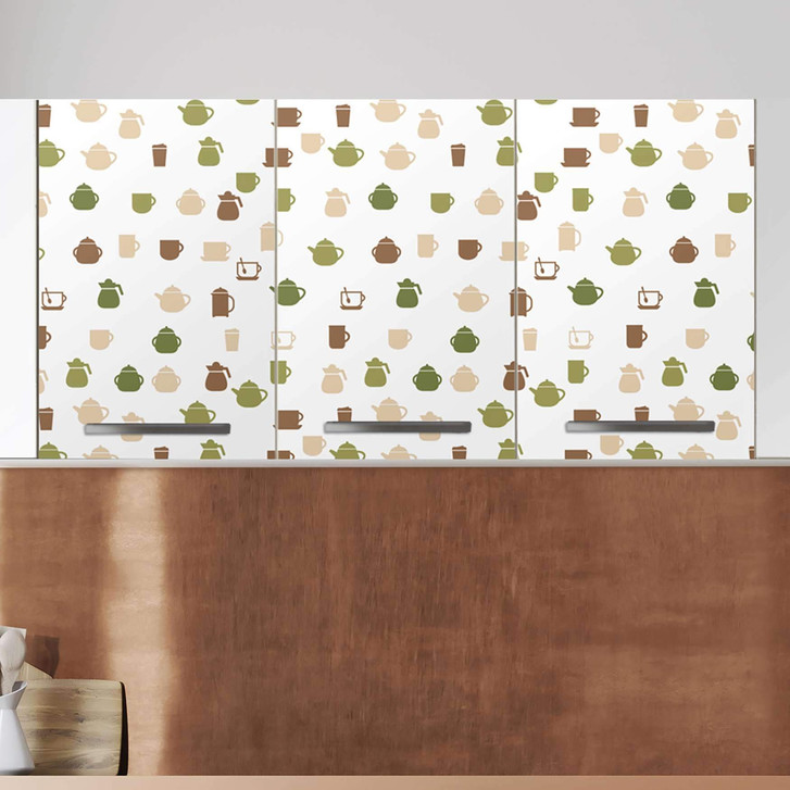 Unsere Klebefolie Cans and Cups (120cm Breite - entspricht der Breite von 3 Türen) für den Wandschrank ist der Blickfang in jeder Küche. Die Küchenfolien sind hochwertige, selbsthaftende Vinylfolien (seidenmatt) und können auf das gewünschte Mass zugeschnitten werden – je nachdem ob die Türkante umklebt werden soll oder nicht.