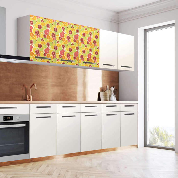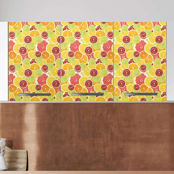 Unsere Klebefolie Citrus (120cm Breite - entspricht der Breite von 3 Türen) für den Wandschrank ist der Blickfang in jeder Küche. Die Küchenfolien sind hochwertige, selbsthaftende Vinylfolien (seidenmatt) und können auf das gewünschte Mass zugeschnitten werden – je nachdem ob die Türkante umklebt werden soll oder nicht.