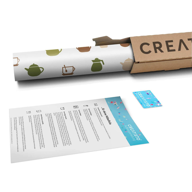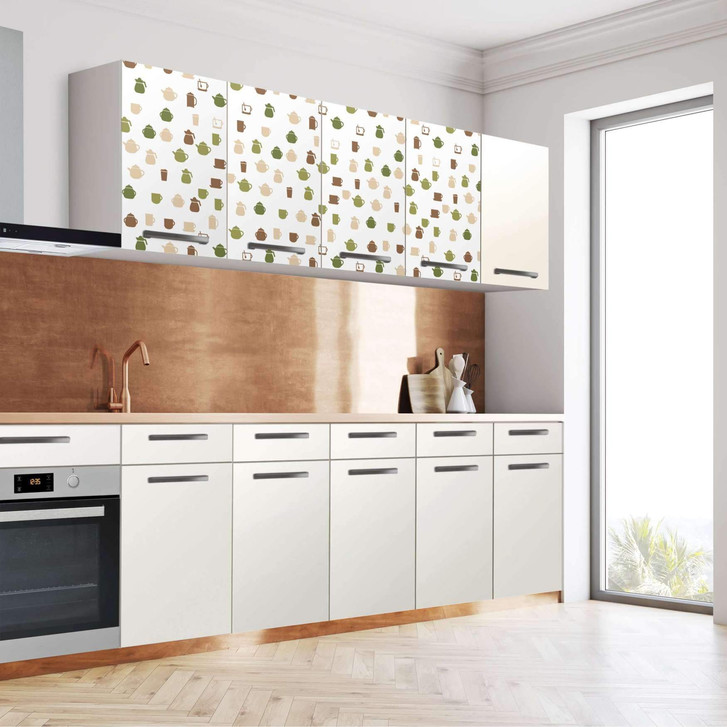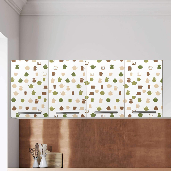 Unsere Klebefolie Cans and Cups (160cm Breite - entspricht der Breite von 4 Türen) für den Wandschrank ist der Blickfang in jeder Küche. Die Küchenfolien sind hochwertige, selbsthaftende Vinylfolien (seidenmatt) und können auf das gewünschte Mass zugeschnitten werden – je nachdem ob die Türkante umklebt werden soll oder nicht.
