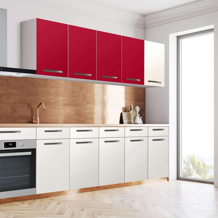 Unsere Klebefolie Rot Dark (160cm Breite - entspricht der Breite von 4 Türen) für den Wandschrank ist der Blickfang in jeder Küche. Die Küchenfolien sind hochwertige, selbsthaftende Vinylfolien (seidenmatt) und können auf das gewünschte Mass zugeschnitten werden – je nachdem ob die Türkante umklebt werden soll oder nicht.