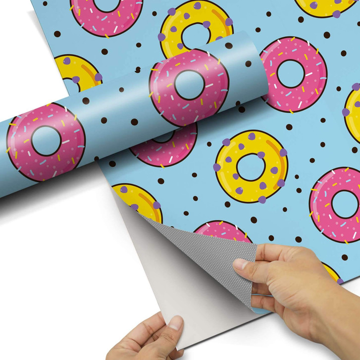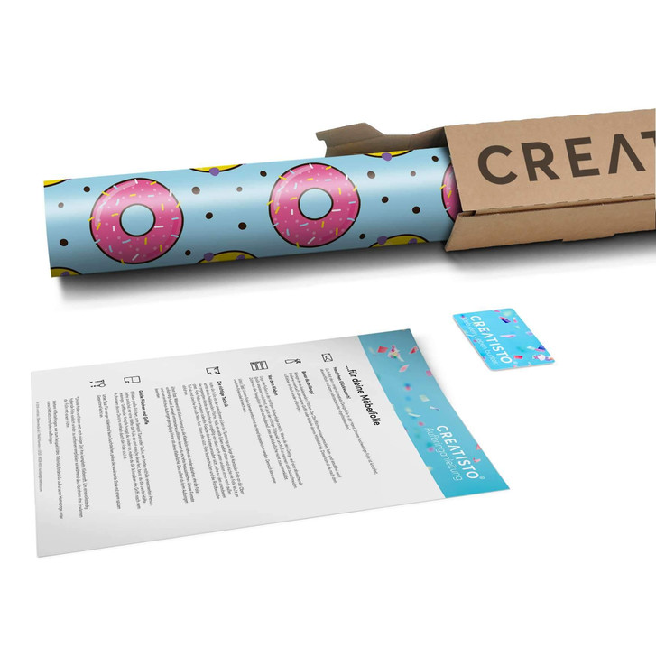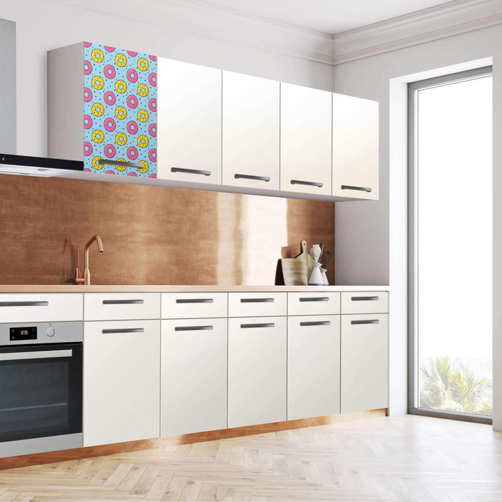 Unsere Klebefolie Donutparty (40cm Breite - entspricht der Breite von 1 Tür) für den Wandschrank ist der Blickfang in jeder Küche. Die Küchenfolien sind hochwertige, selbsthaftende Vinylfolien (seidenmatt) und können auf das gewünschte Mass zugeschnitten werden – je nachdem ob die Türkante umklebt werden soll oder nicht.