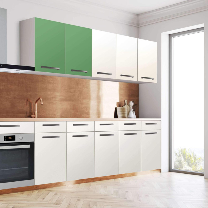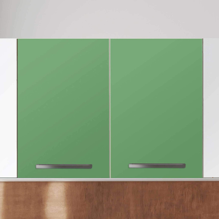 Unsere Klebefolie Grün Light (80cm Breite - entspricht der Breite von 2 Türen) für den Wandschrank ist der Blickfang in jeder Küche. Die Küchenfolien sind hochwertige, selbsthaftende Vinylfolien (seidenmatt) und können auf das gewünschte Mass zugeschnitten werden – je nachdem ob die Türkante umklebt werden soll oder nicht.