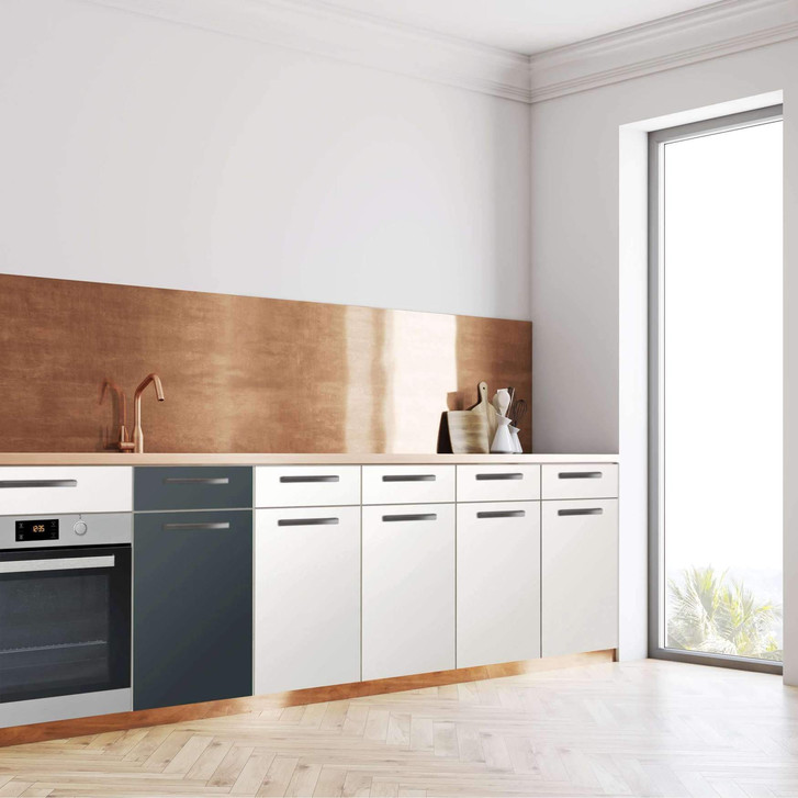 Unsere Küchenfolie Blaugrau Dark (40cm Breite - entspricht der Breite von 1 Tür) für den Unterschrank ist der Blickfang in jeder Küche. Die Küchenfolien sind hochwertige, selbsthaftende Vinylfolien (seidenmatt) und können auf das gewünschte Mass zugeschnitten werden – je nachdem ob die Türkante umklebt werden soll oder nicht.