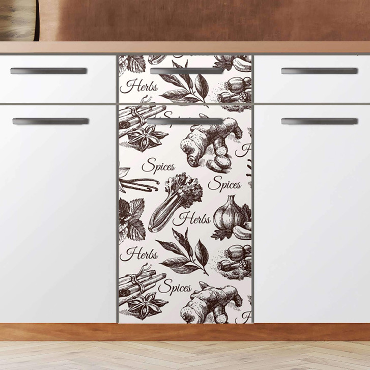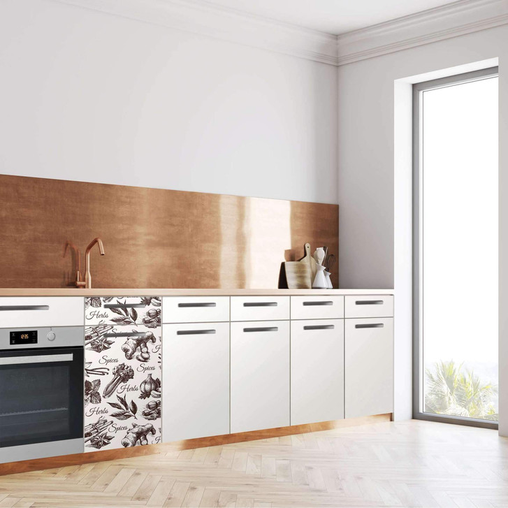 Unsere Küchenfolie Spices (40cm Breite - entspricht der Breite von 1 Tür) für den Unterschrank ist der Blickfang in jeder Küche. Die Küchenfolien sind hochwertige, selbsthaftende Vinylfolien (seidenmatt) und können auf das gewünschte Mass zugeschnitten werden – je nachdem ob die Türkante umklebt werden soll oder nicht.