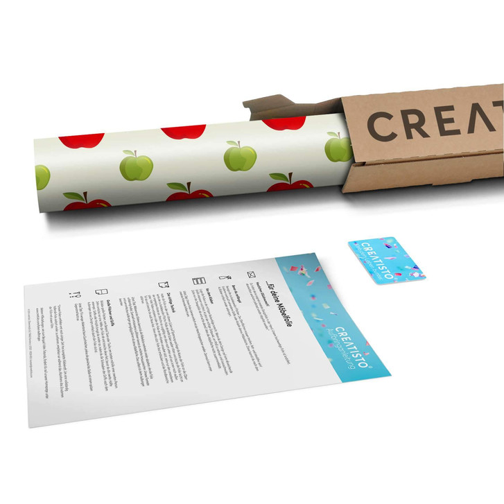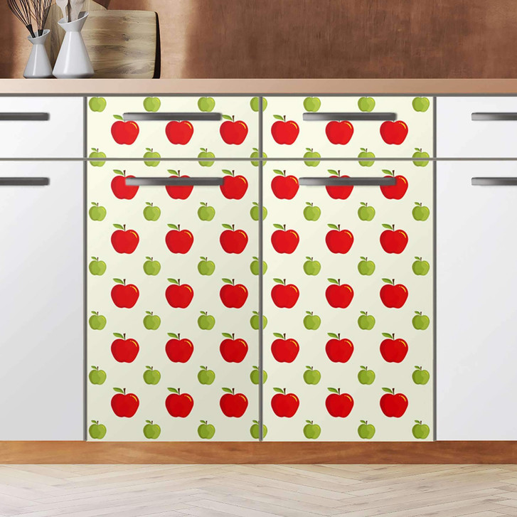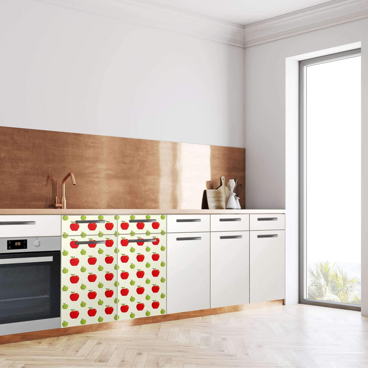 Unsere Küchenfolie An apple a day (80cm Breite - entspricht der Breite von 2 Türen) für den Unterschrank ist der Blickfang in jeder Küche. Die Küchenfolien sind hochwertige, selbsthaftende Vinylfolien (seidenmatt) und können auf das gewünschte Mass zugeschnitten werden – je nachdem ob die Türkante umklebt werden soll oder nicht.
