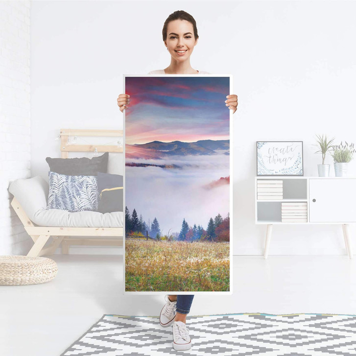 Das Trägerpapier von der Folie ca. 10-20 cm abziehen und am oberen Bereich des Objektes positionieren. Zieh jetzt das Trägerpapier Stück für Stück von der Motivfolie nach unten hin ab und streiche das Motiv vorsichtig an der Möbeloberfläche fest.