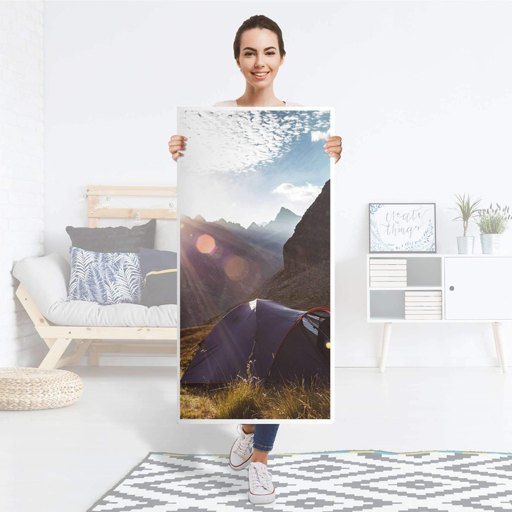 Das Trägerpapier von der Folie ca. 10-20 cm abziehen und am oberen Bereich des Objektes positionieren. Zieh jetzt das Trägerpapier Stück für Stück von der Motivfolie nach unten hin ab und streiche das Motiv vorsichtig an der Möbeloberfläche fest.