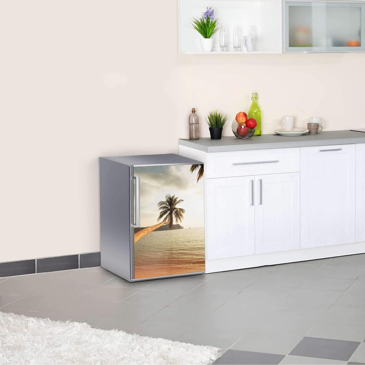 Unsere Kühlschrankfolie Paradise für die Kühlschrankgrösse 60x80cm ist der Blickfang in jeder Küche. Die Dekofolien sind hochwertige, selbsthaftende Vinylfolien (seidenmatt) und können dank Bubble-free Technologie kinderleicht verklebt werden.