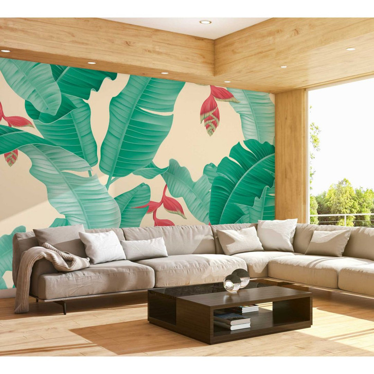 Livingwalls Fototapete ARTist Heliconia mit Palmenblättern creme, gelb, grün, rot