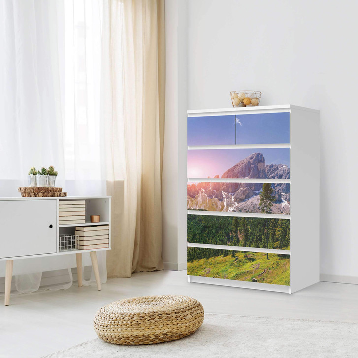 Unsere Möbel Klebefolie Alpenblick für die Malm Kommode 6 Schubladen (hoch) ist der Blickfang in jedem Schlafzimmer. Die Dekofolien sind hochwertige, selbsthaftende Vinylfolien (seidenmatt) und können dank Bubble-free Technologie kinderleicht verklebt werden.