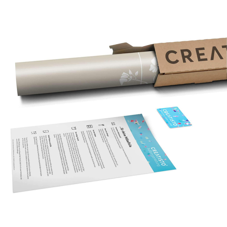 Das Trägerpapier von der Folie ca. 10-20 cm abziehen und am oberen Bereich des Objektes positionieren. Zieh jetzt das Trägerpapier Stück für Stück von der Motivfolie nach unten hin ab und streiche das Motiv vorsichtig an der Möbeloberfläche fest.
