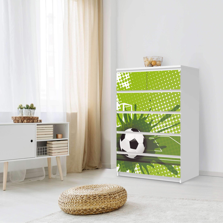 Unsere Möbel Klebefolie Goal für die Malm Kommode 6 Schubladen (hoch) ist der Blickfang in jedem Kinderzimmer. Die Dekofolien sind hochwertige, selbsthaftende Vinylfolien (seidenmatt) und können dank Bubble-free Technologie kinderleicht verklebt werden.