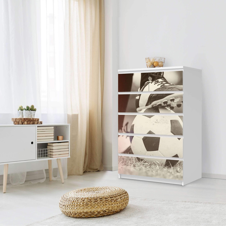 Unsere Möbel Klebefolie Kick it für die Malm Kommode 6 Schubladen (hoch) ist der Blickfang in jedem Kinderzimmer. Die Dekofolien sind hochwertige, selbsthaftende Vinylfolien (seidenmatt) und können dank Bubble-free Technologie kinderleicht verklebt werden.