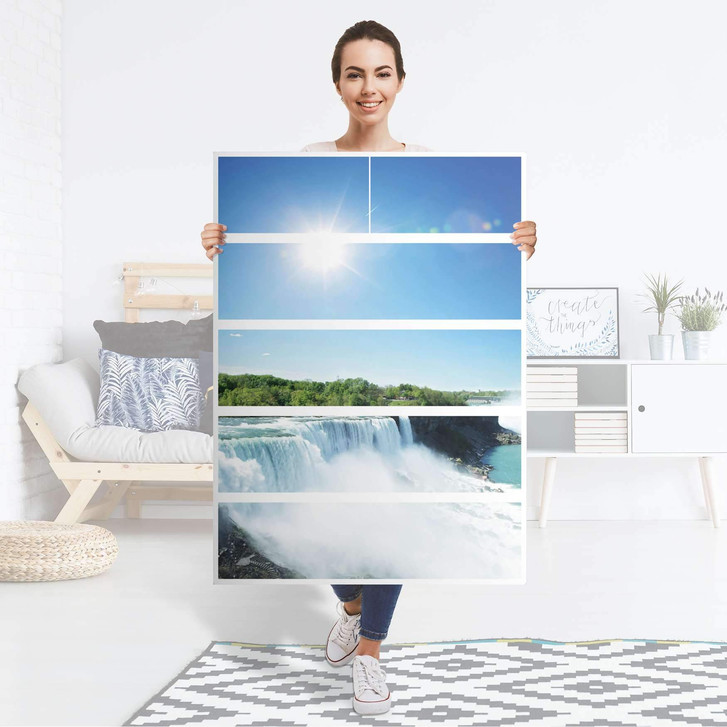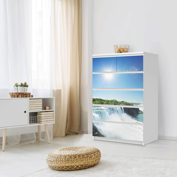 Unsere Möbel Klebefolie Niagara Falls für die Malm Kommode 6 Schubladen (hoch) ist der Blickfang in jedem Schlafzimmer. Die Dekofolien sind hochwertige, selbsthaftende Vinylfolien (seidenmatt) und können dank Bubble-free Technologie kinderleicht verklebt werden.